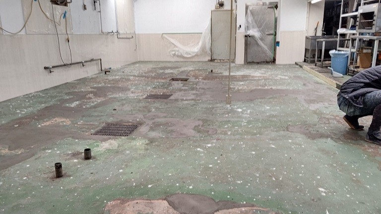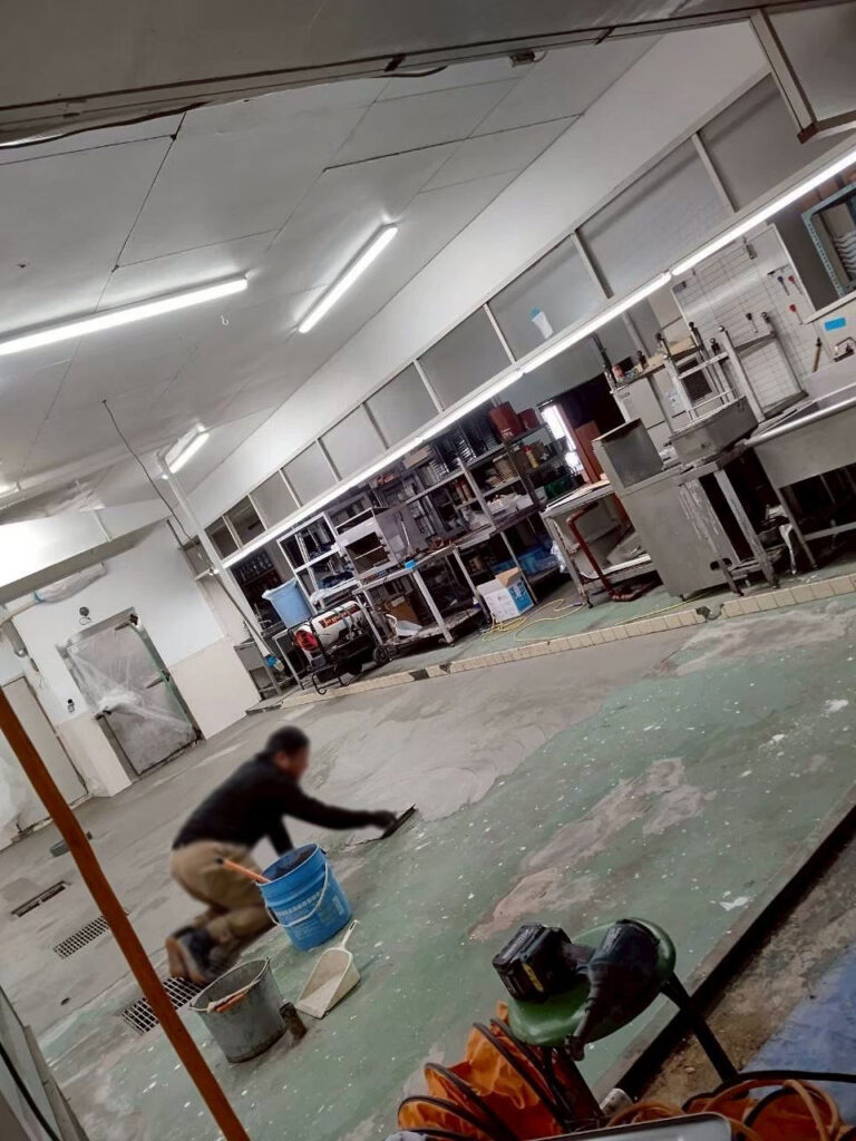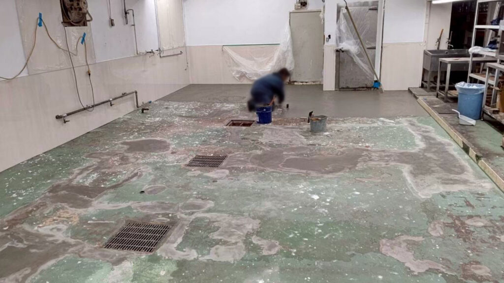 旅館厨房のリフォーム 凹んだ部分を埋め速乾性のある下地材で全体を均していき、仕上げの床材を施工できるように左官施工しています。